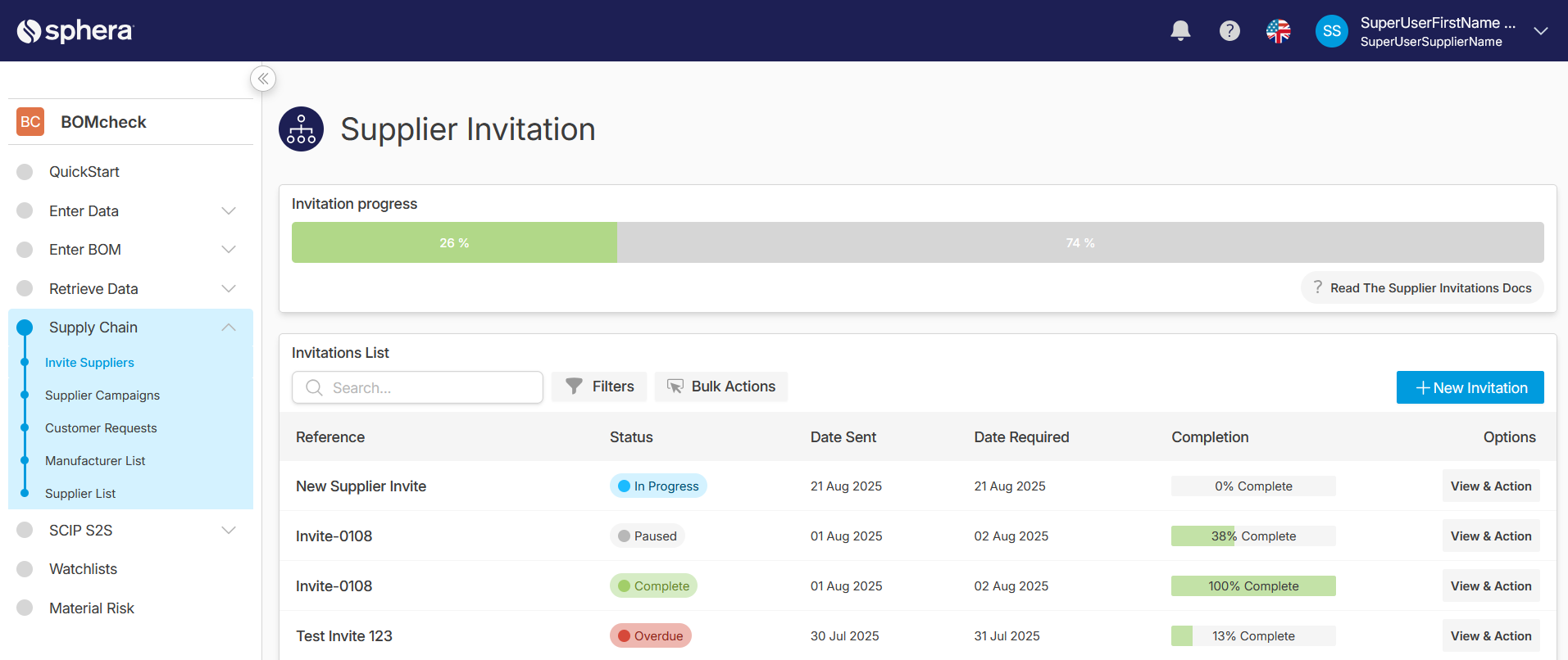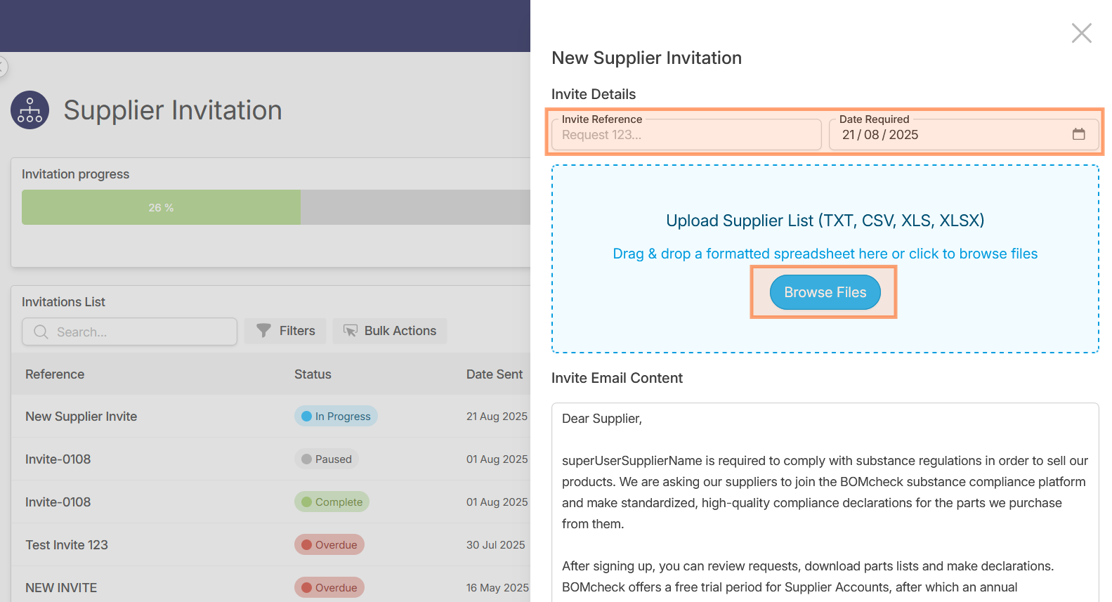 You can delete a supplier invitation lists at any time. For example, once all suppliers in your list have joined BOMcheck, you may wish to delete the list to keep your workspace organized. Once deleted, all associated emails and notifications will cease sending.
