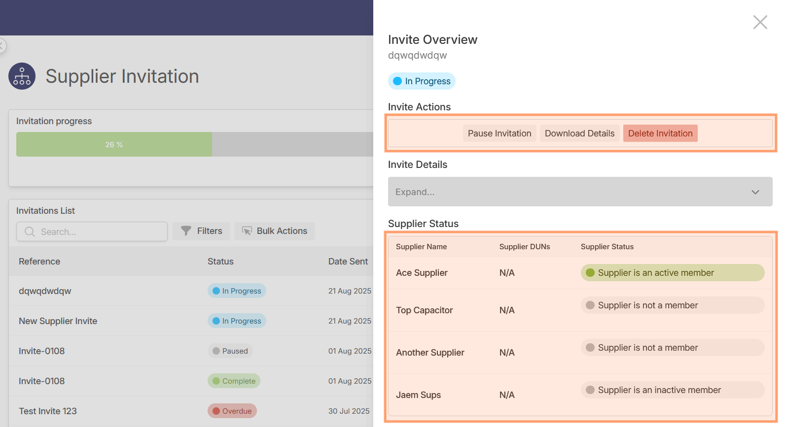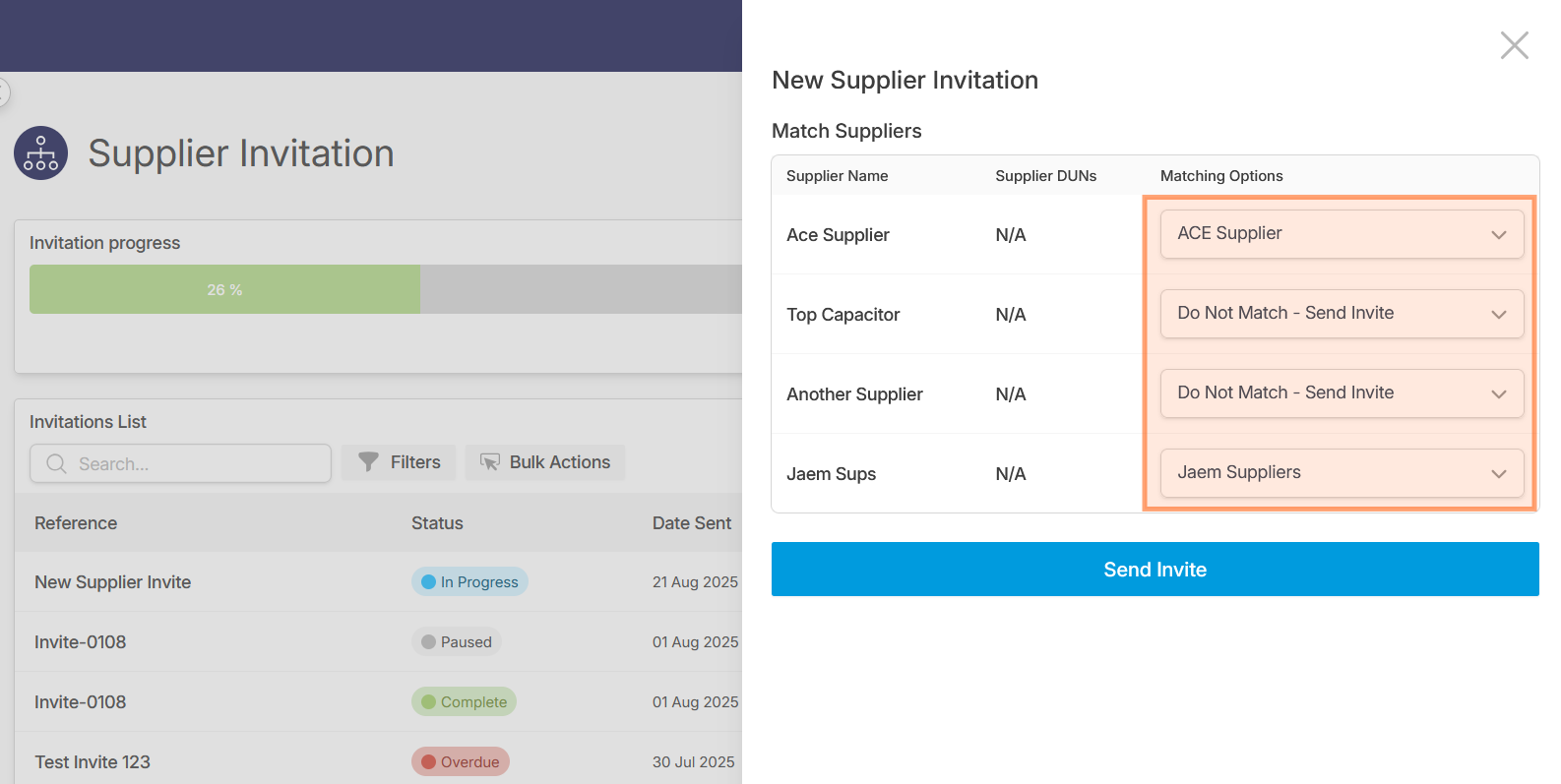 If a supplier is matched (manually or automatically), they will not receive an invitation email. Instead, the match will be recorded in your supplier list.