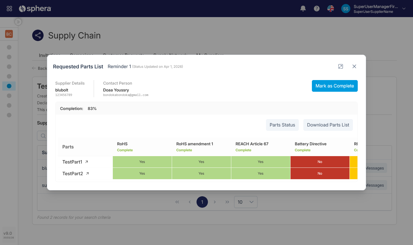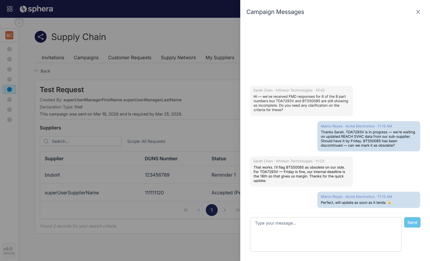 Every supplier campaign now includes a messaging channel alongside the request tracker. Manufacturers and suppliers can follow up on incomplete declarations, clarify regulatory questions, confirm part status, and coordinate on deadlines without leaving the platform.